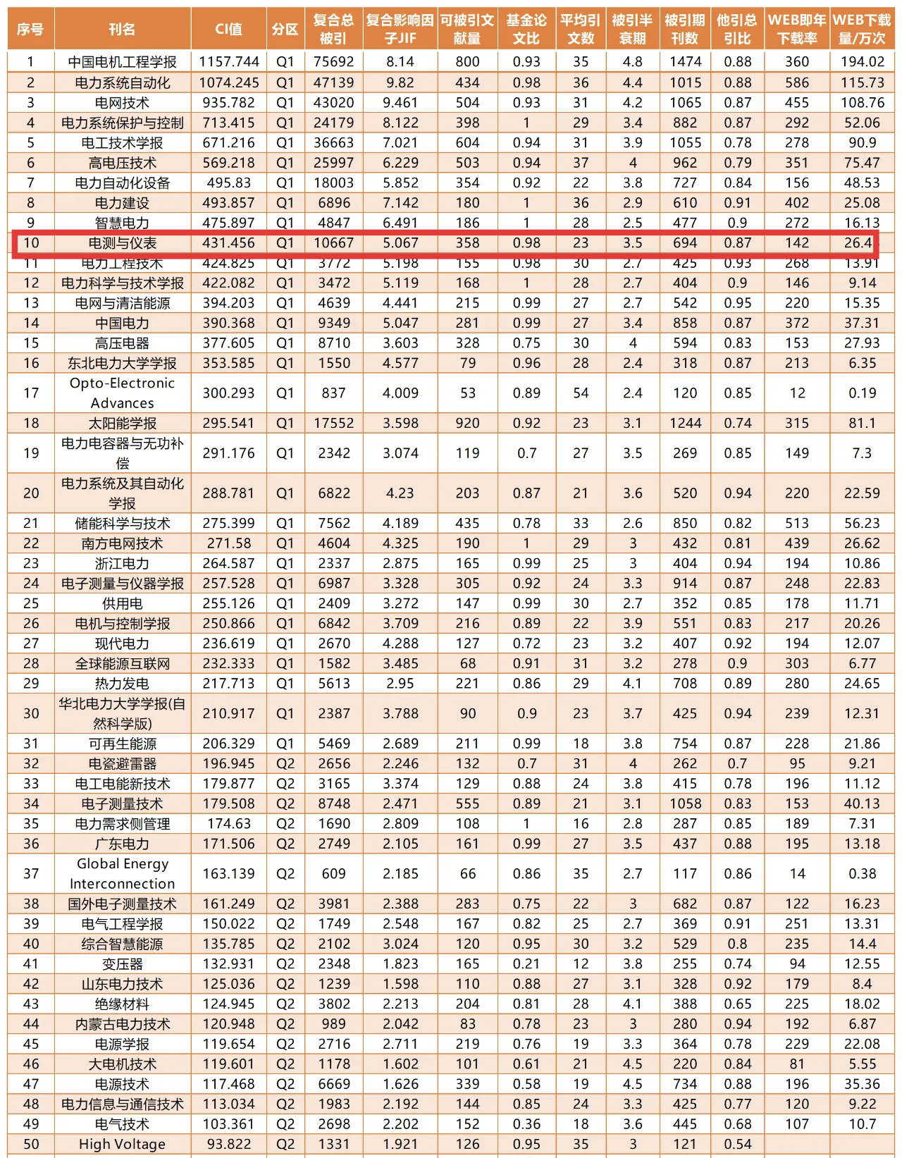 《中国学术期刊影响因子年报》(2025版)于近日发布,《电测与仪表》影响力指数(CI值)为431.456,在126本电气工程类期刊中排名第十;复合影响因子达到5.067,较上年4.215增长20%,复合总被引突破1万次,多项指标创历史新高。标志着本刊在电工技术及仪器仪表学术出版领域的核心地位获得权威认可。